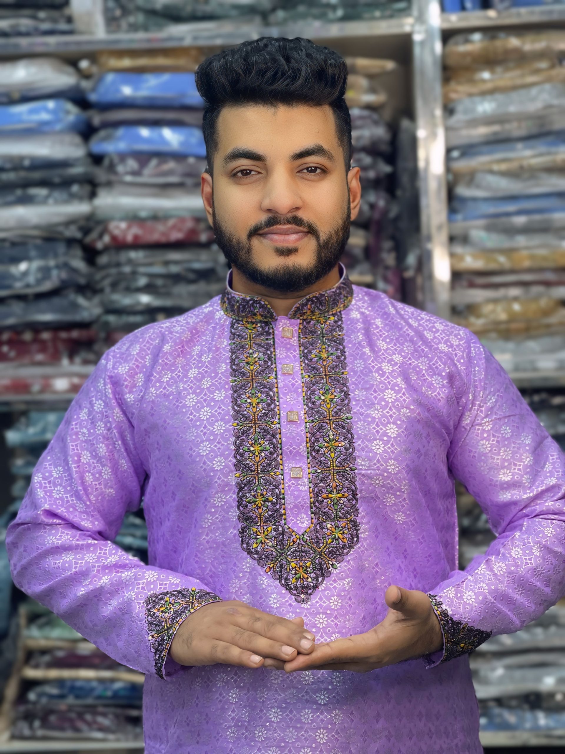 পাঞ্জাবির বুক, কলার ও হাতায় রয়েছে মাল্টি-সিকোয়েন্স এমব্রয়ডারি ওয়ার্ক
